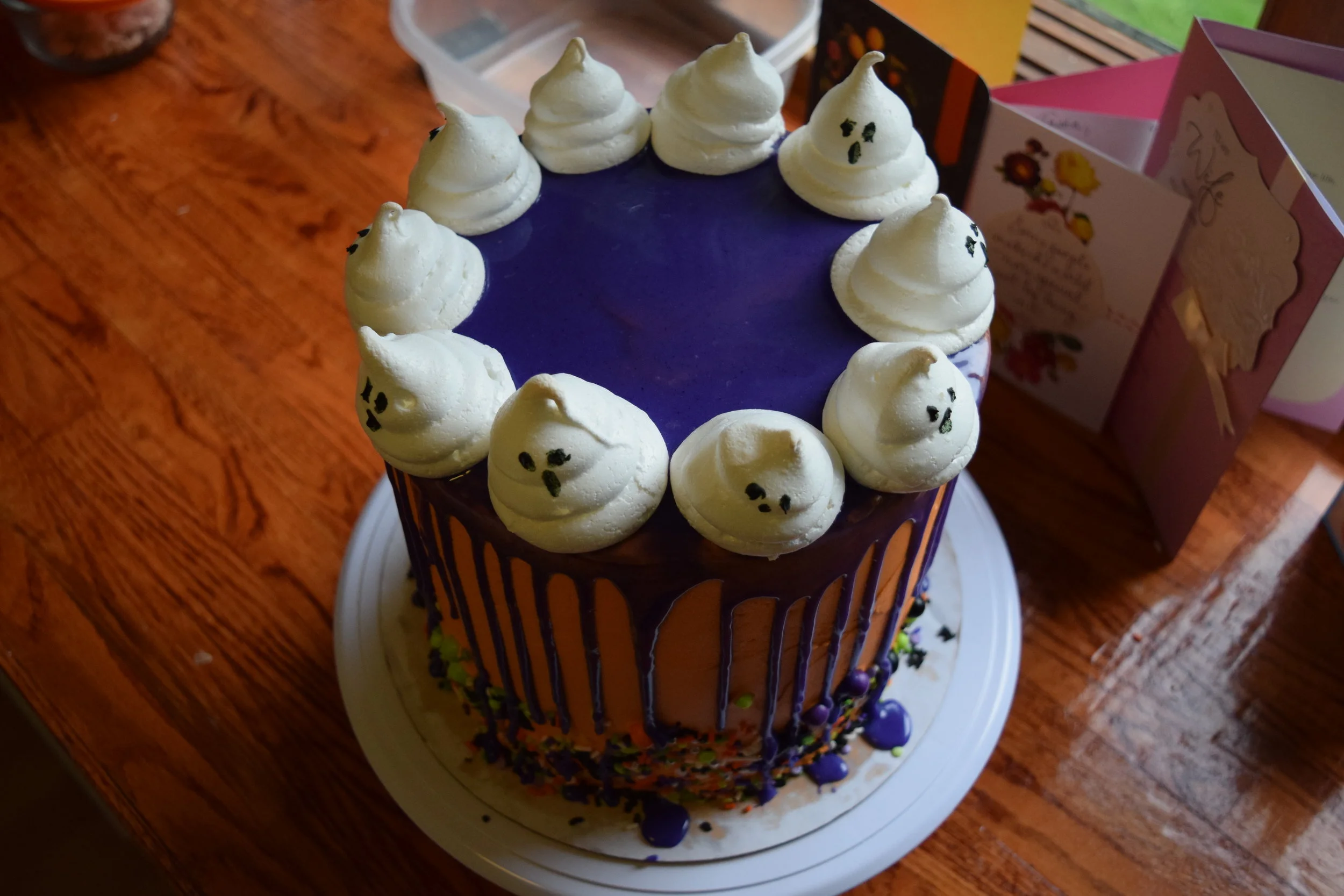 Lastly place ghost meringue cookies on top of cake and its ready to enjoy!!