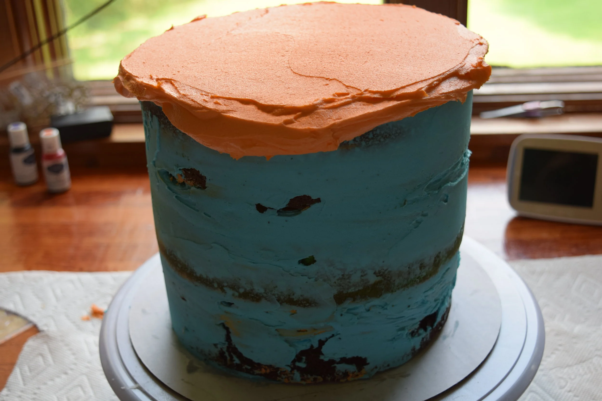 Bake for about 25-30 minutes until it passes the tooth pick test! While the cake cooled I whipped up a batch of American buttercream. I turned 1/3 of the frosting blue for the crumb layer, I thought it would be fun to cut into the cake and see the hidden blue. The rest of the frosting I turned orange with soft food color gel.