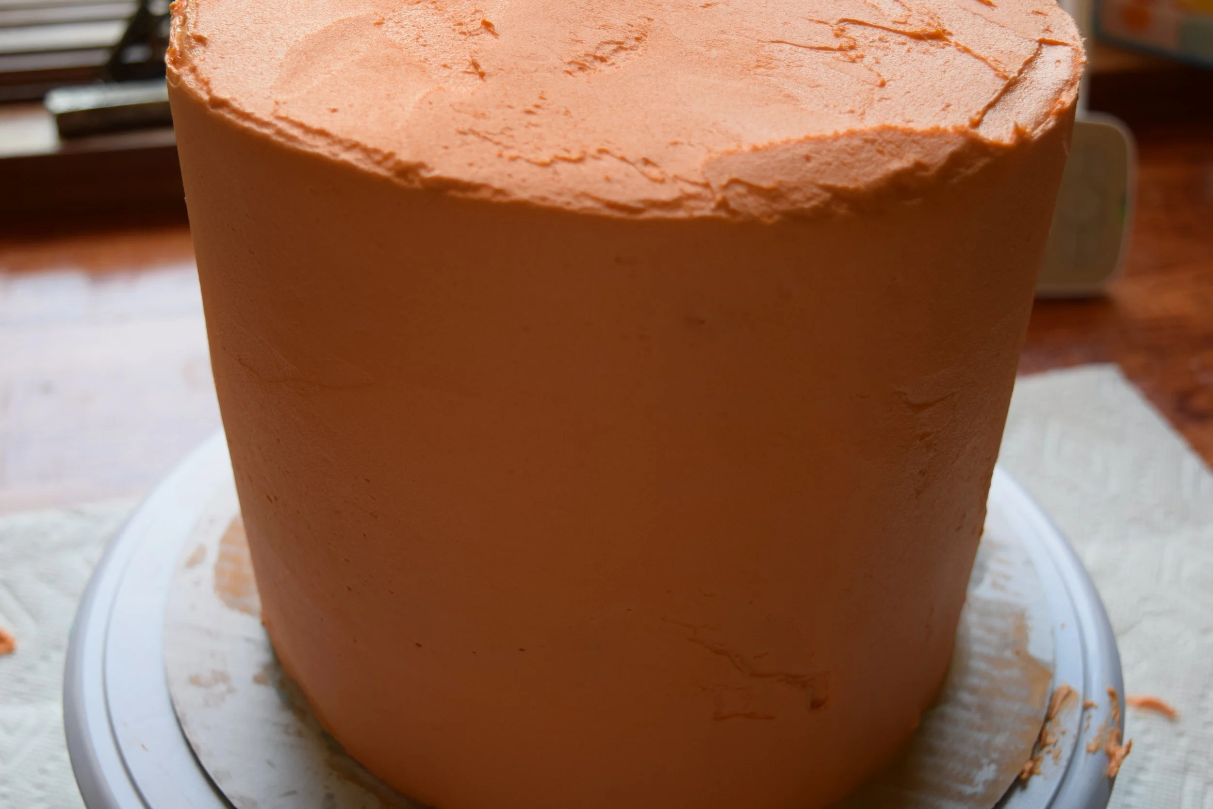 Next add final layer of orange frosting to cake