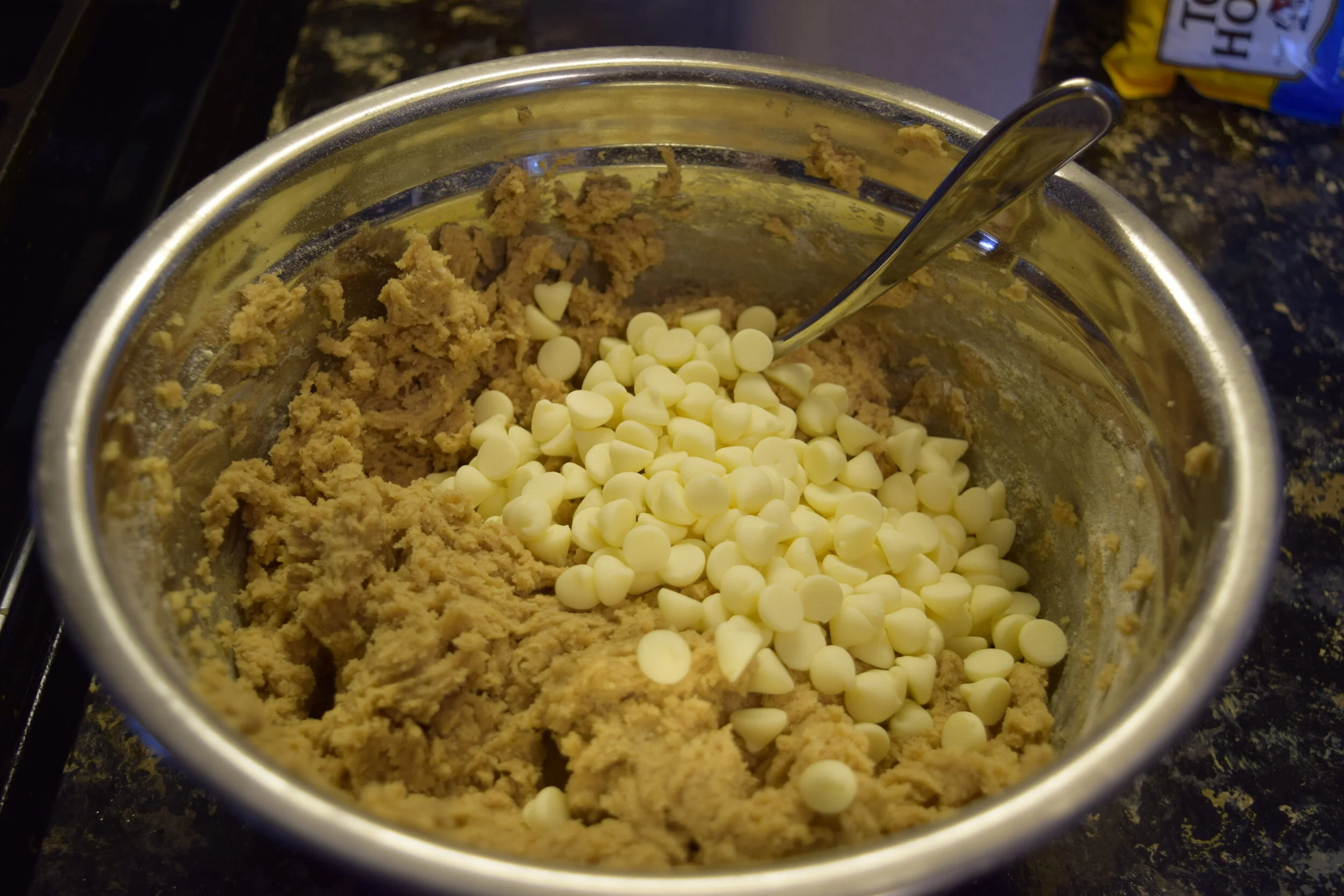 I start by preheating oven to 350 degrees. This I combine wet ingredients in large mixing bowl. Wet ingredients include butter, sugar, eggs, and vanilla extract. Then I add salt, cinnamon, cornstarch baking soda, and flour. Once everything is combined I stir in the chocolate chips. Depending on your taste buds you can use chocolate or white chocolate chips. I’ve done both and love each variation.